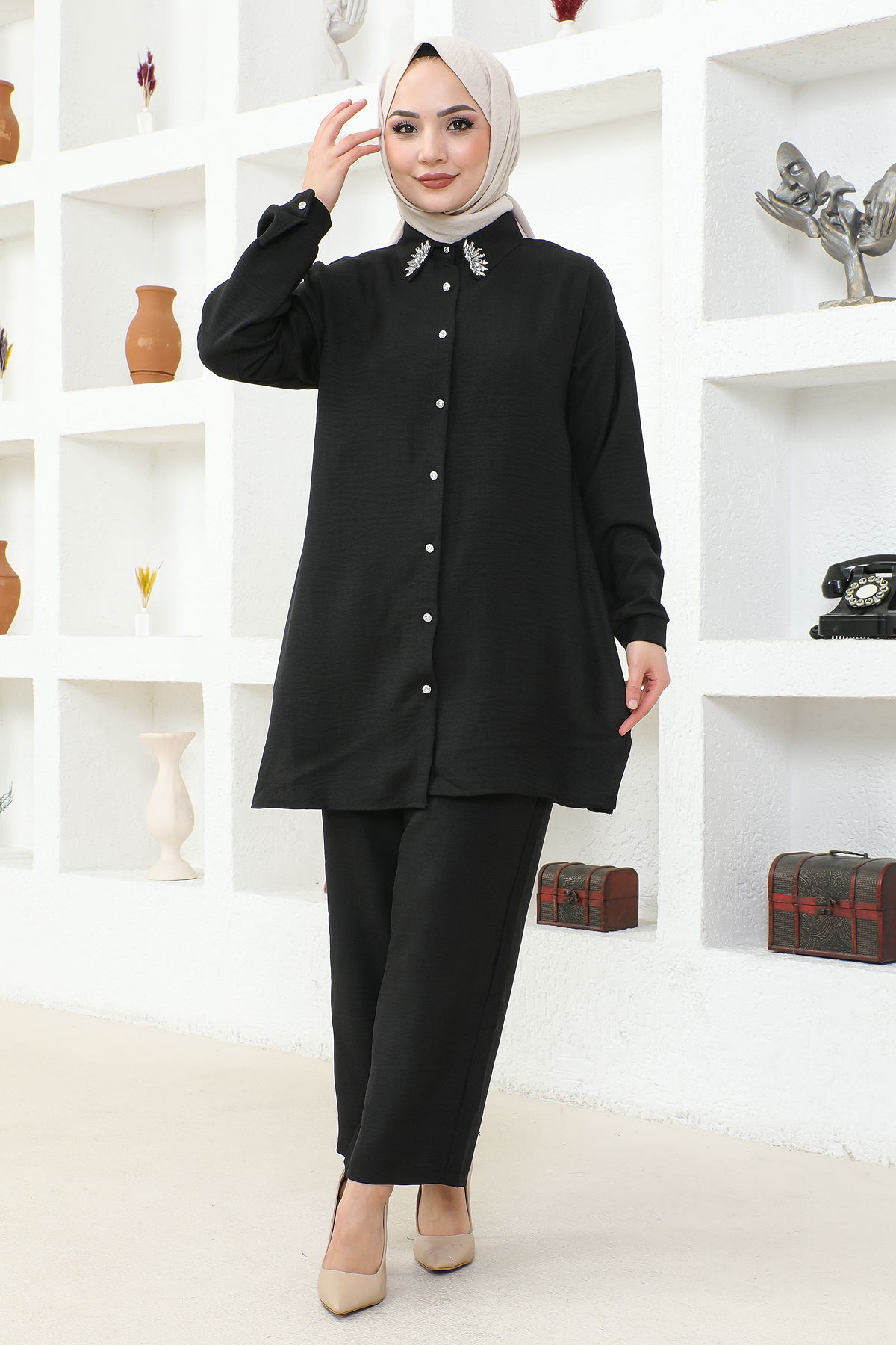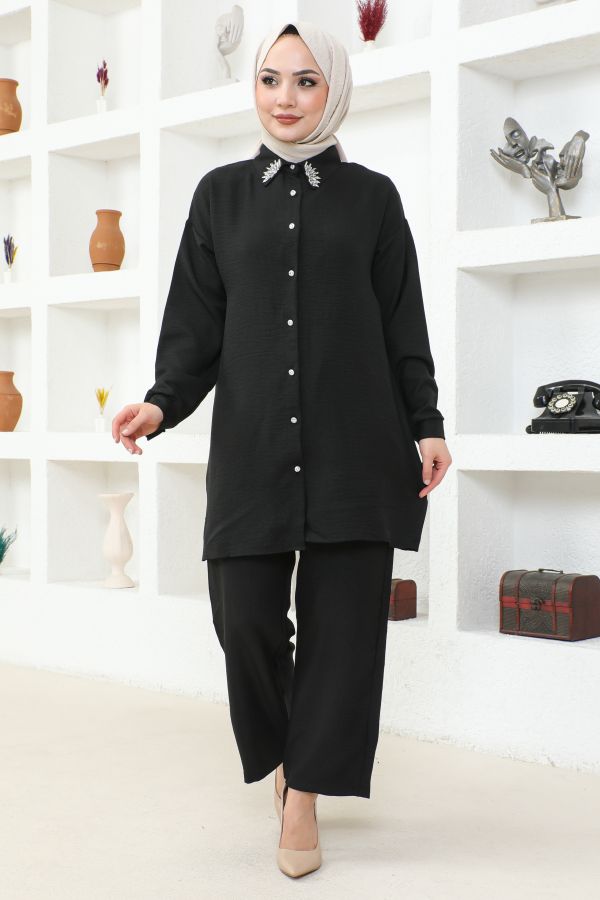 Yaka Taşlı İkili Tesettür Takım-3358 Siyah