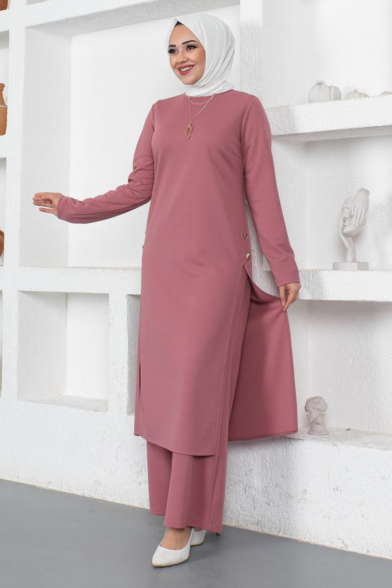 Yanlardan Yırmaçlı Kolyeli İkili Tesettür Takım-3128 Gülkurusu