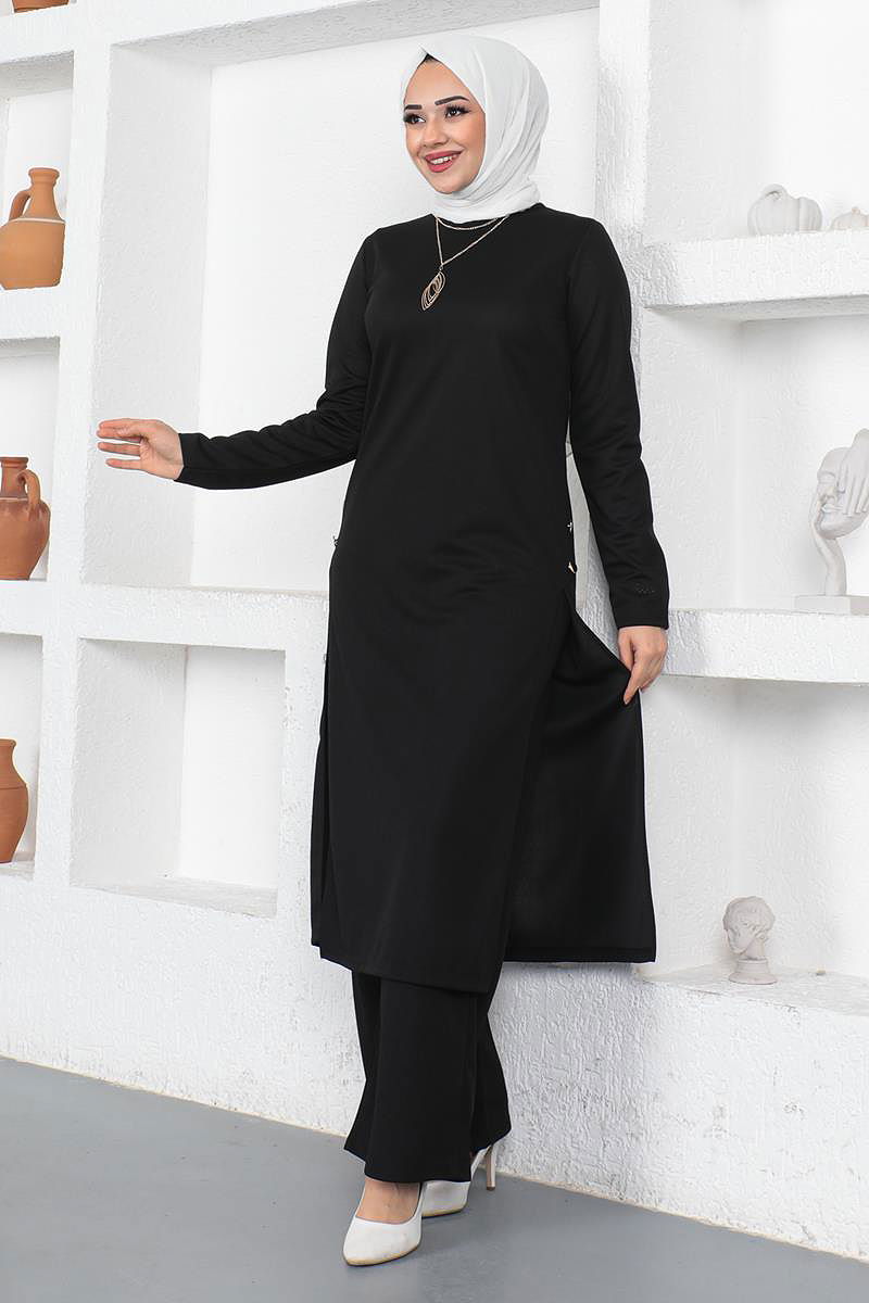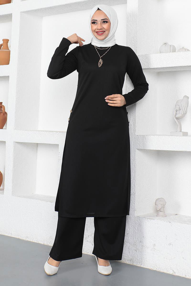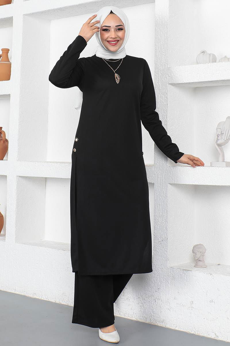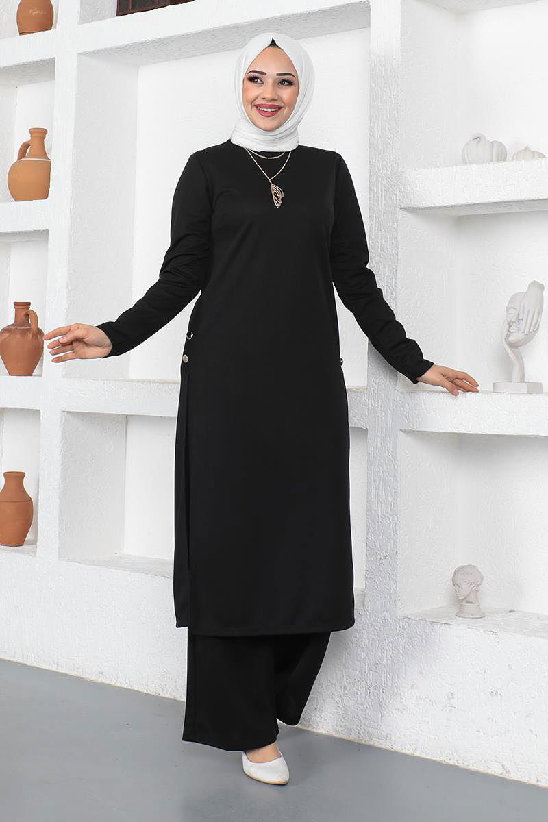 Yanlardan Yırmaçlı Kolyeli İkili Tesettür Takım-3128 Siyah
