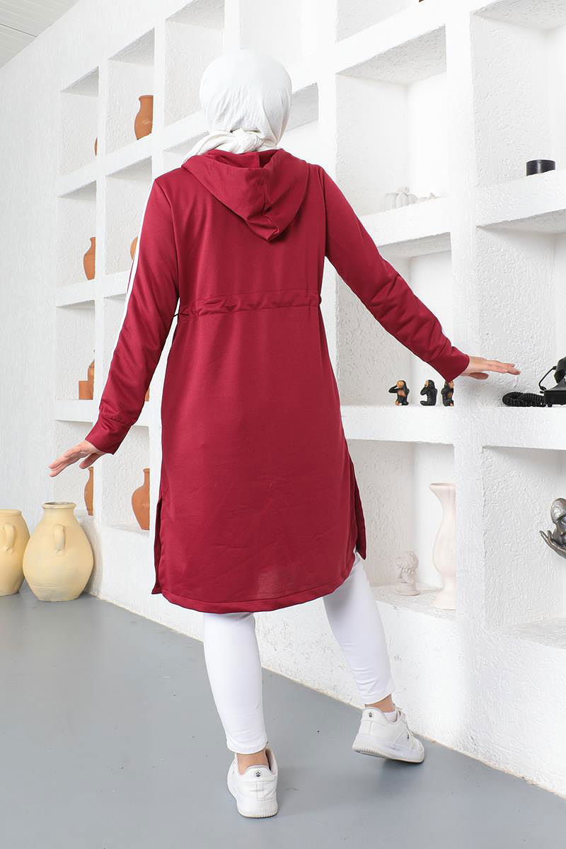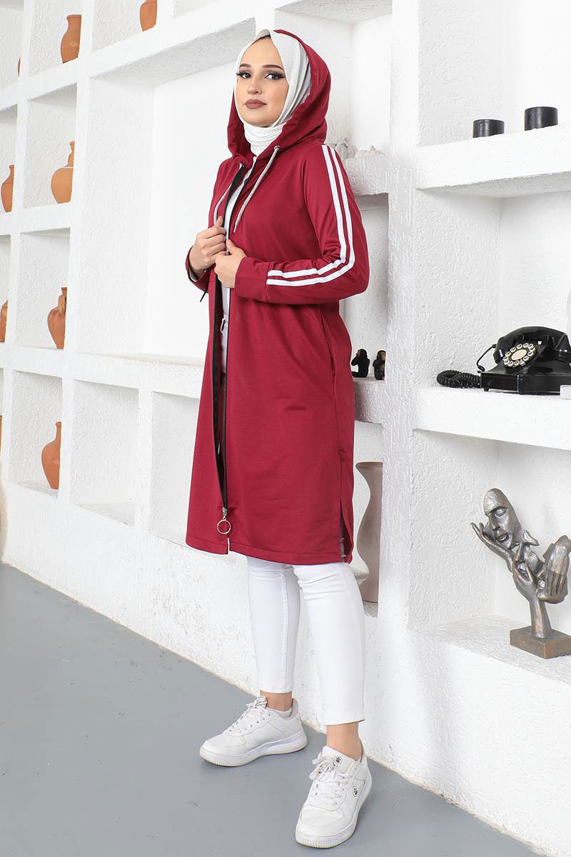 Yanlardan Yırtmaçlı Çizgi Detaylı Tesettür Kap-3112 Bordo