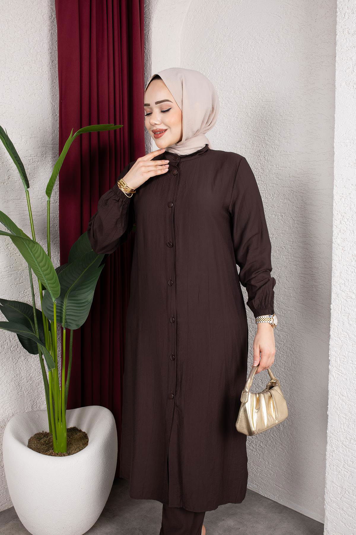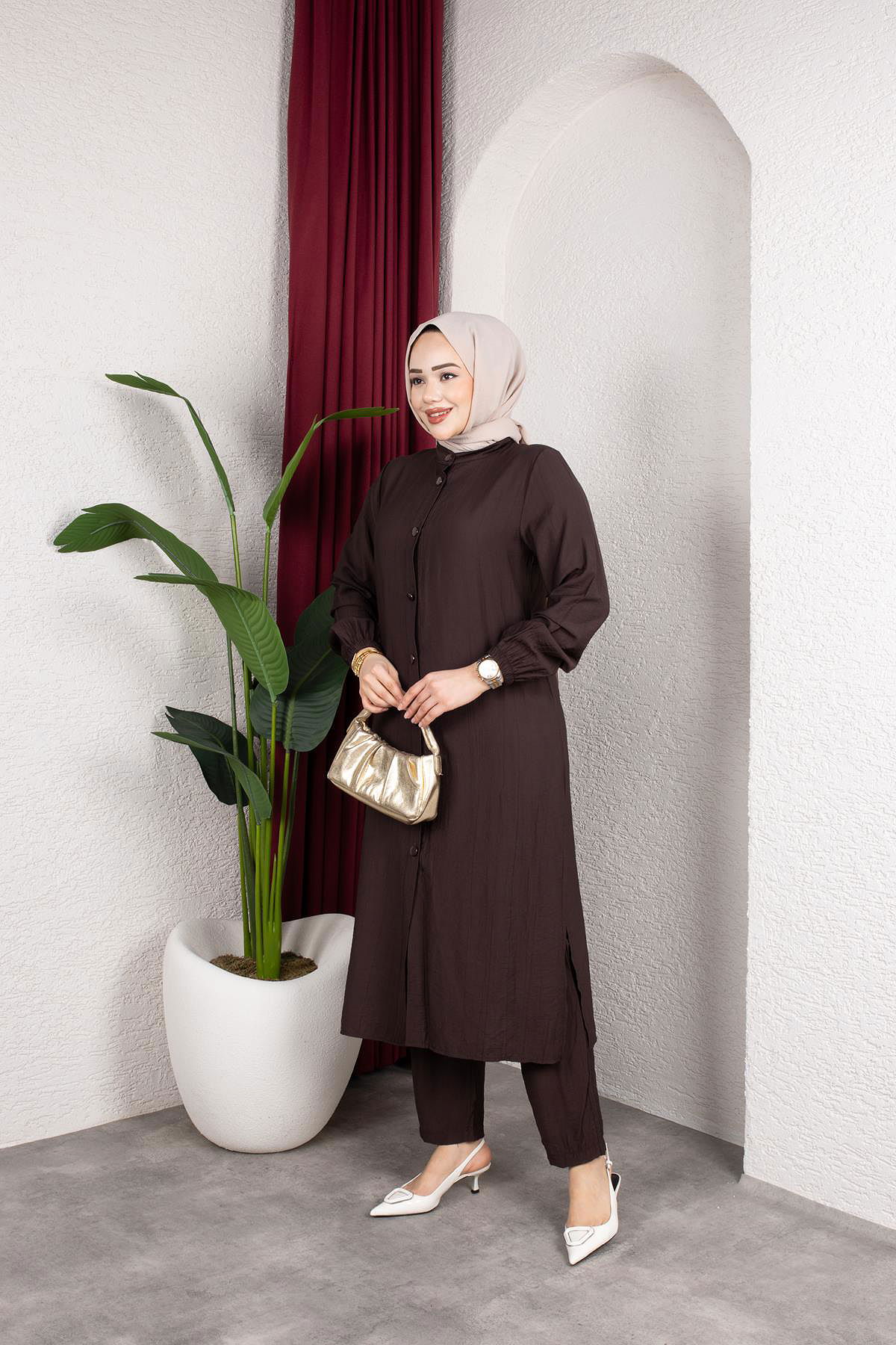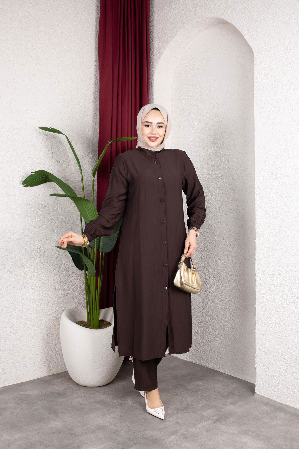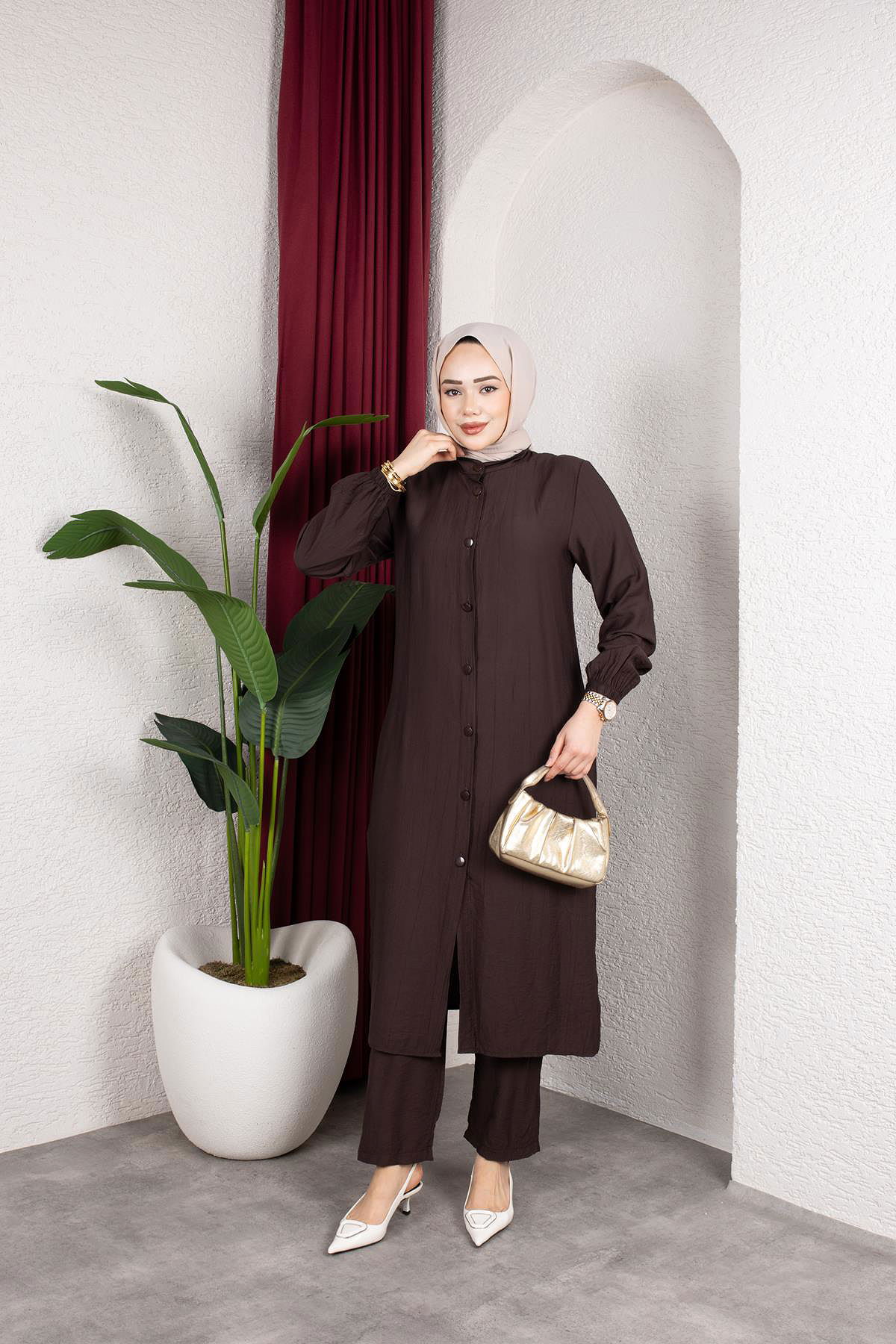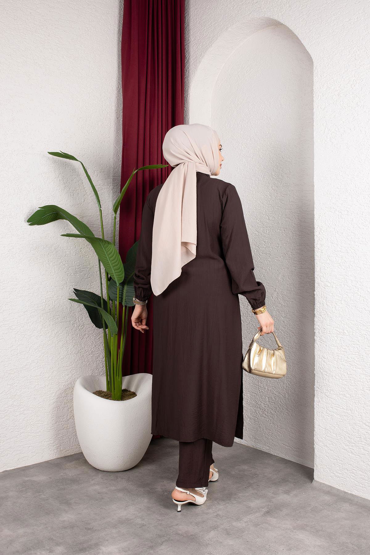 Yanlardan Yırtmaçlı İkili Takım-6461 Kahve