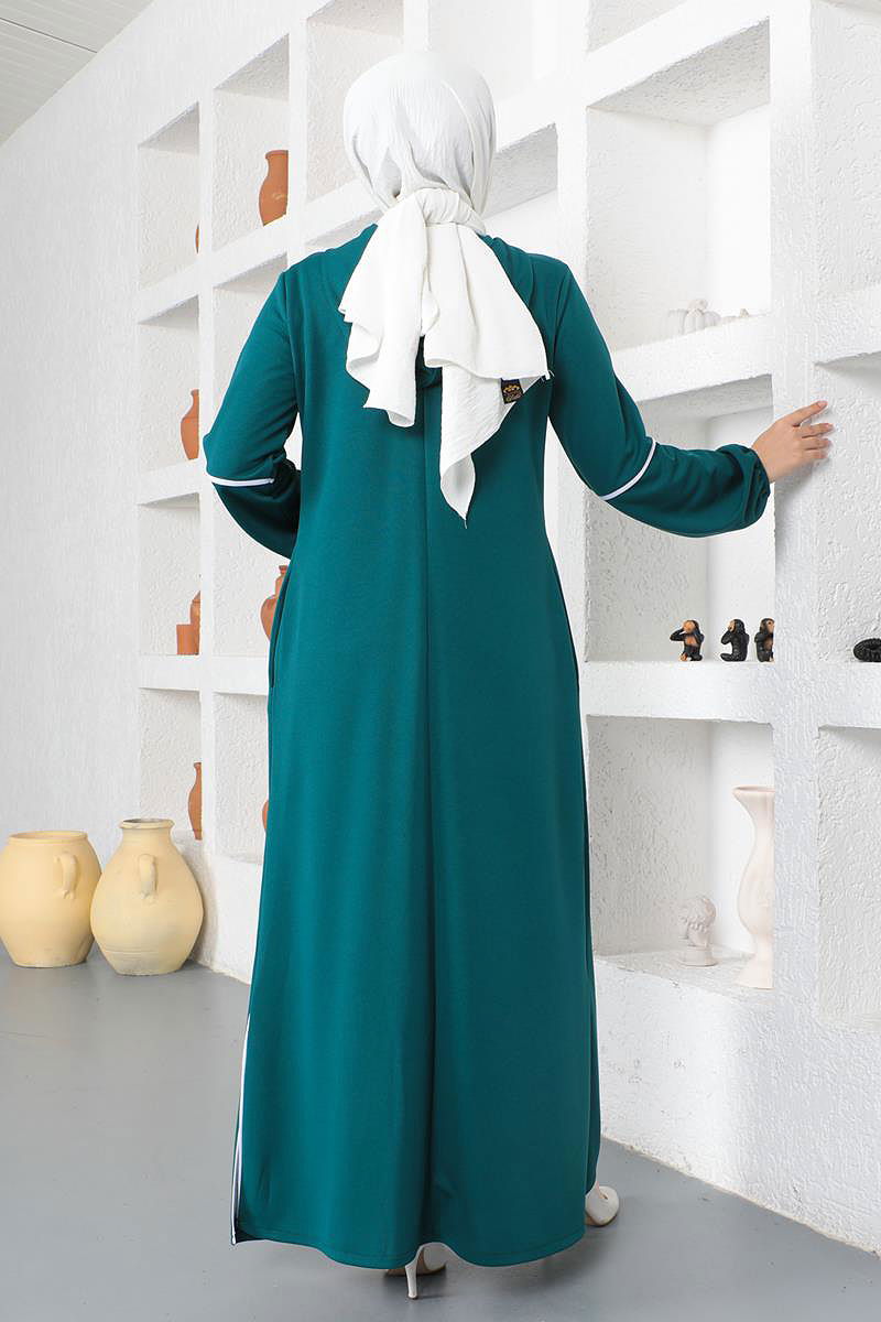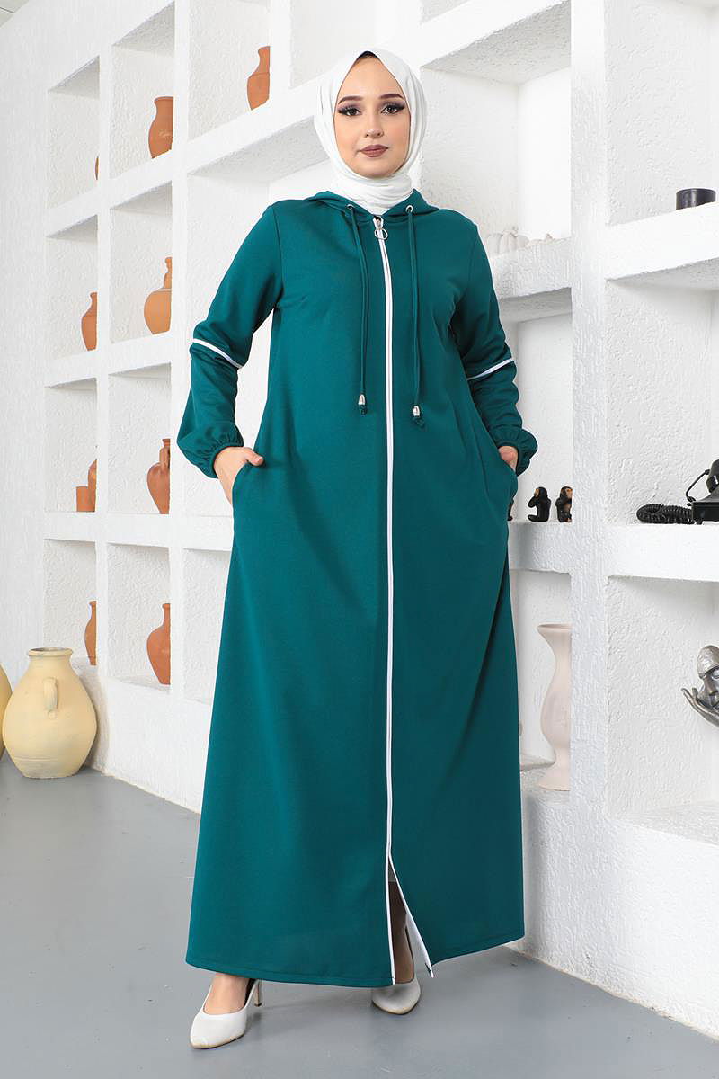 Yanlardan Yırtmaçlı Kapüşonlu Ferace-3118 Zümrütyeşili