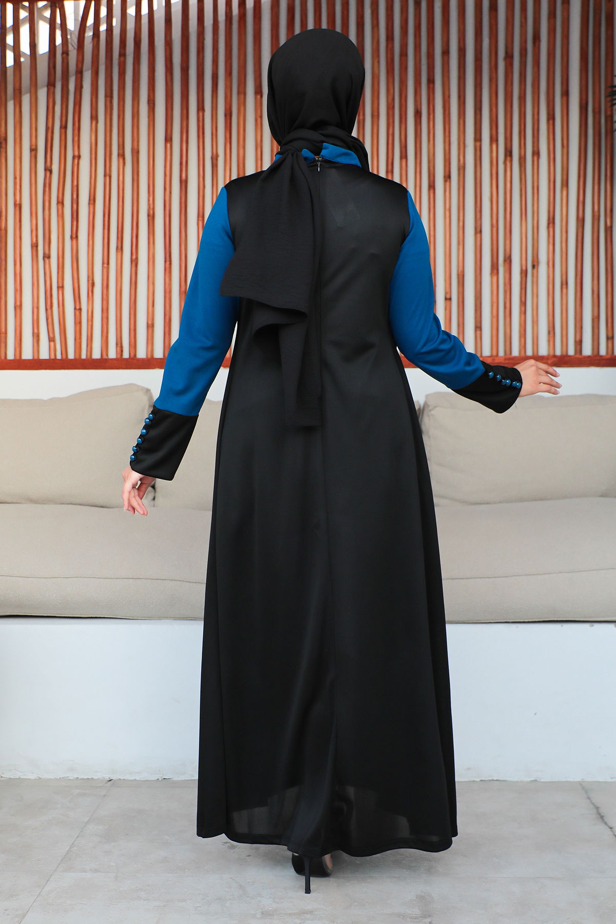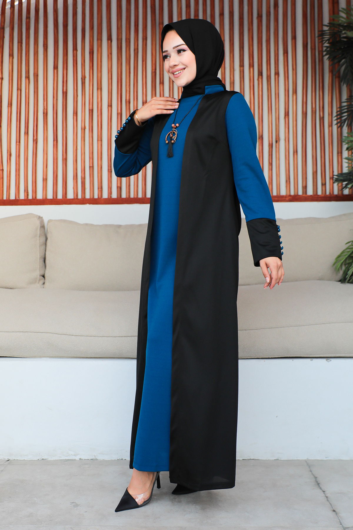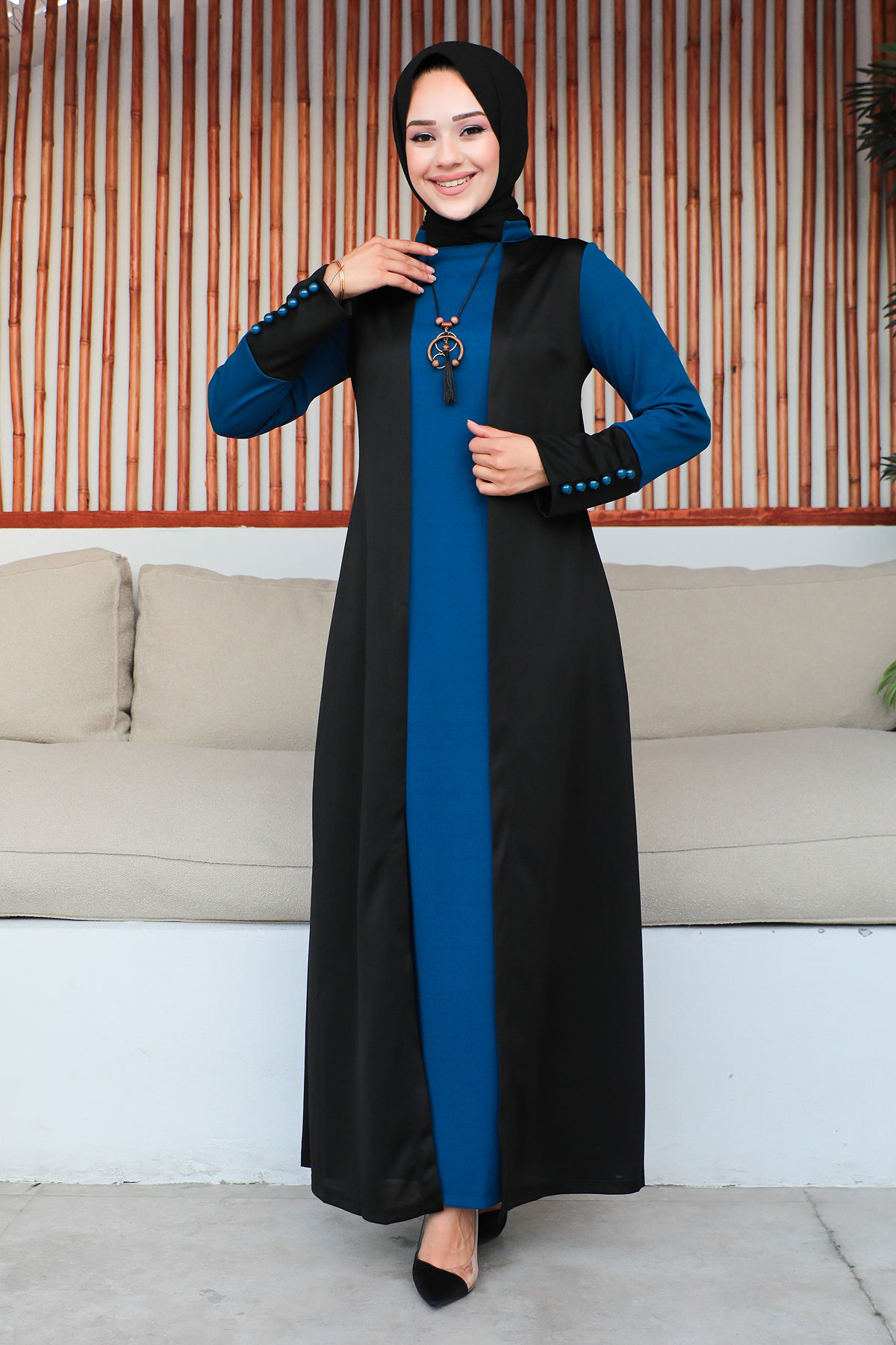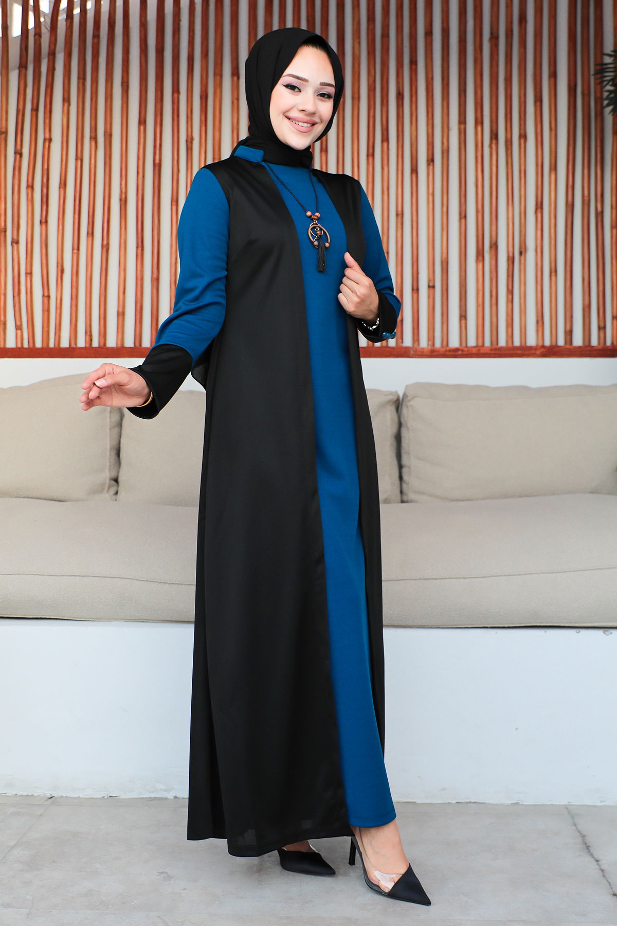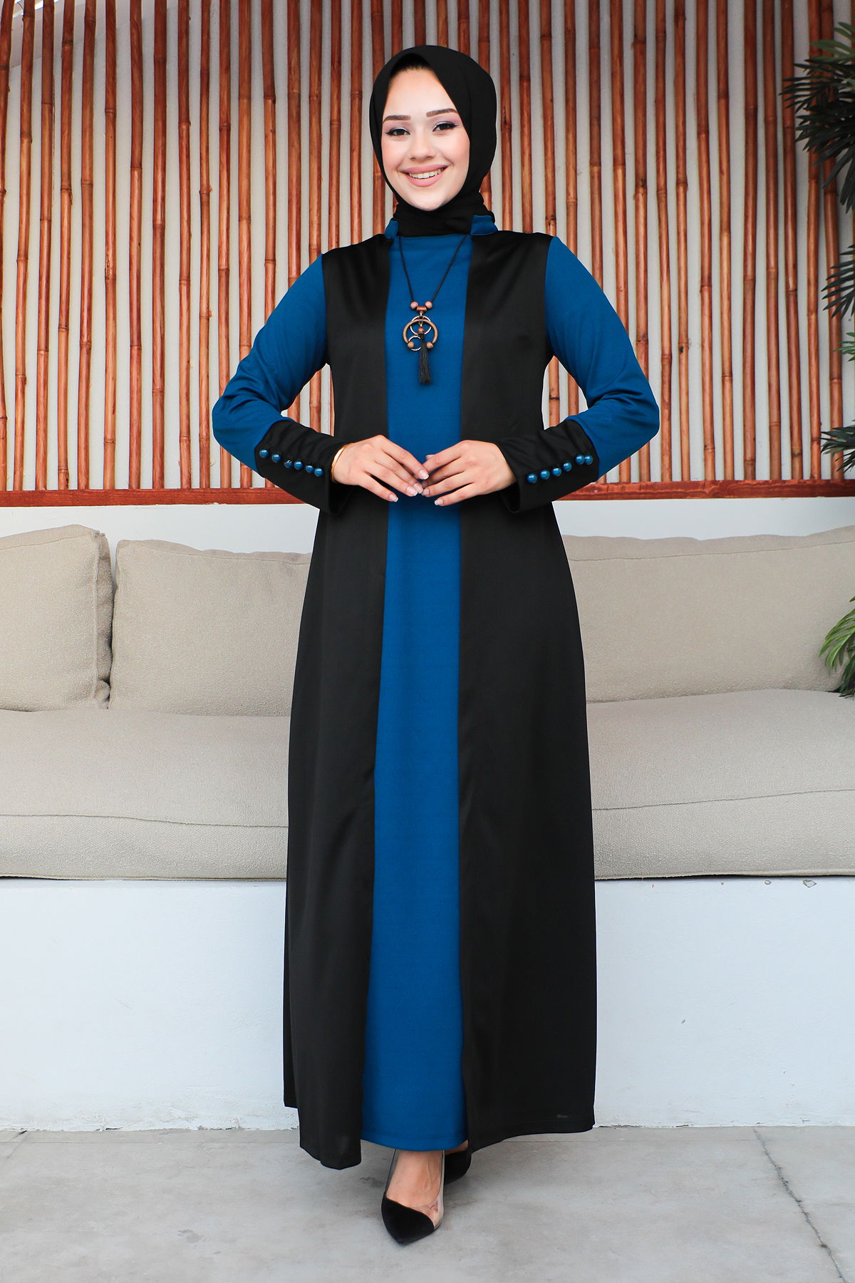 Yelek Görünümlü Kolyeli Tesettür Elbise-3032 İndigo