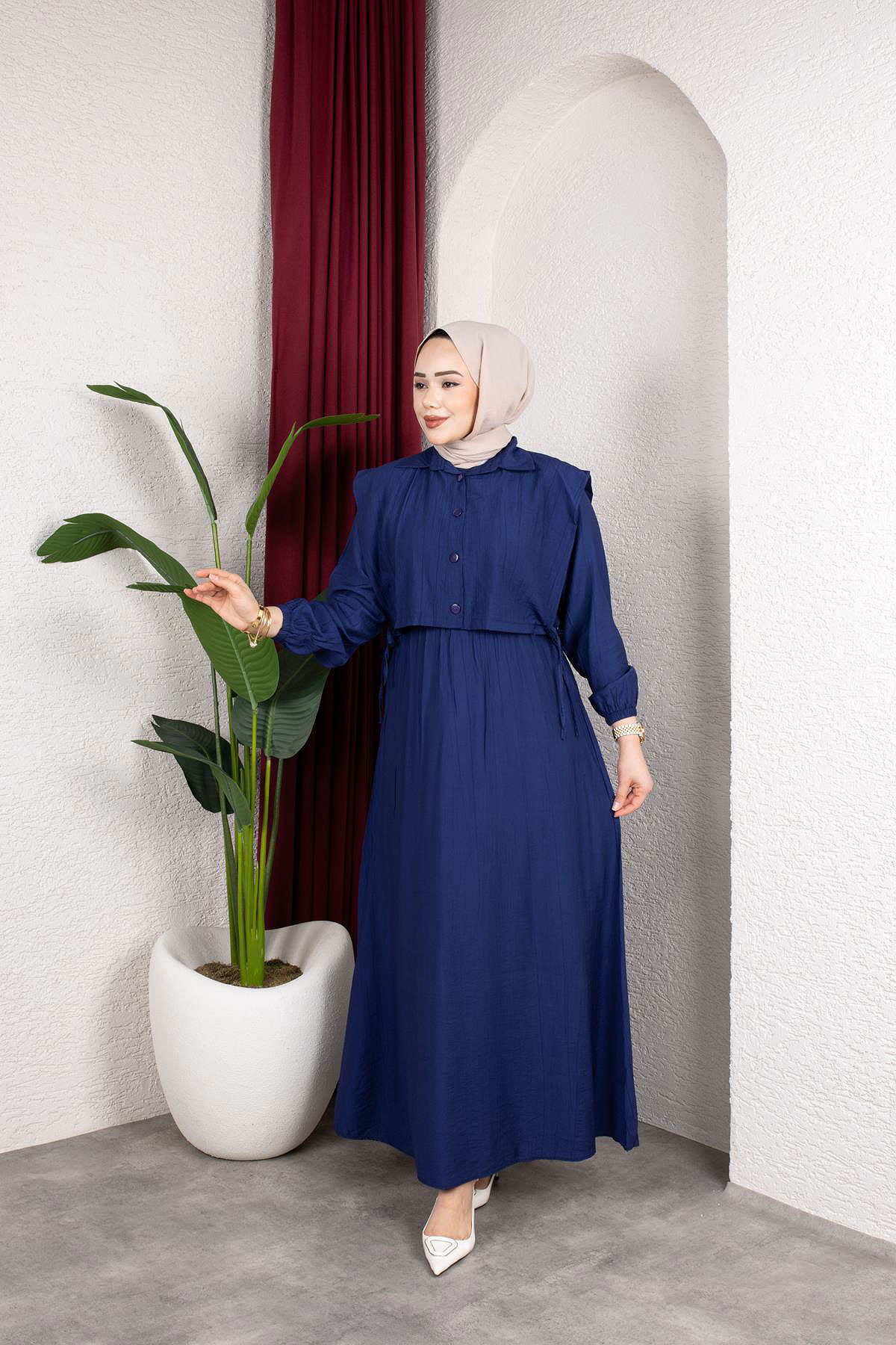 Yelek Görünümlü Modal Elbise-7829 Lacivert